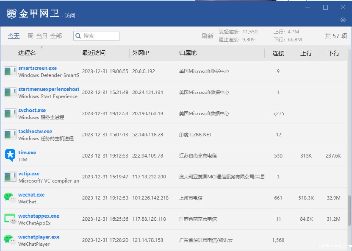 金甲网卫可记录安装机器所有进程对互联网访问的日志,包括访问次数、拒绝次数及流量;可解析进程访问目标IP的所在地区,进程每日对互联网访问的行为一目了然。