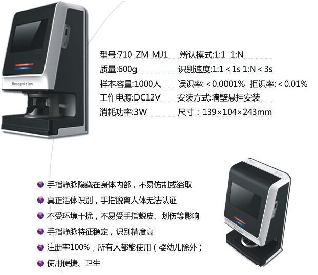 此项技术利用近红外线穿透手指后所得的静脉纹路影像来进行个人识别,是具有高精度,高速度的世界上最尖端的生物识别技术.